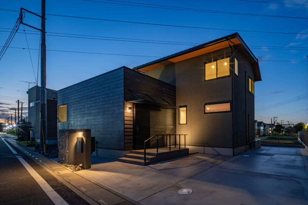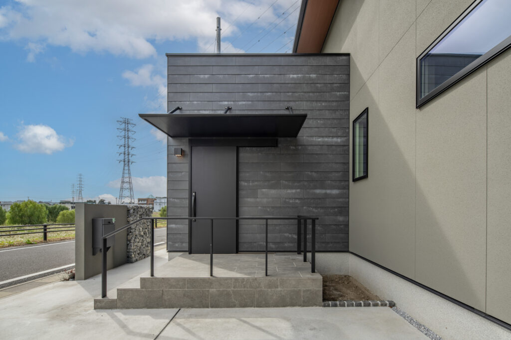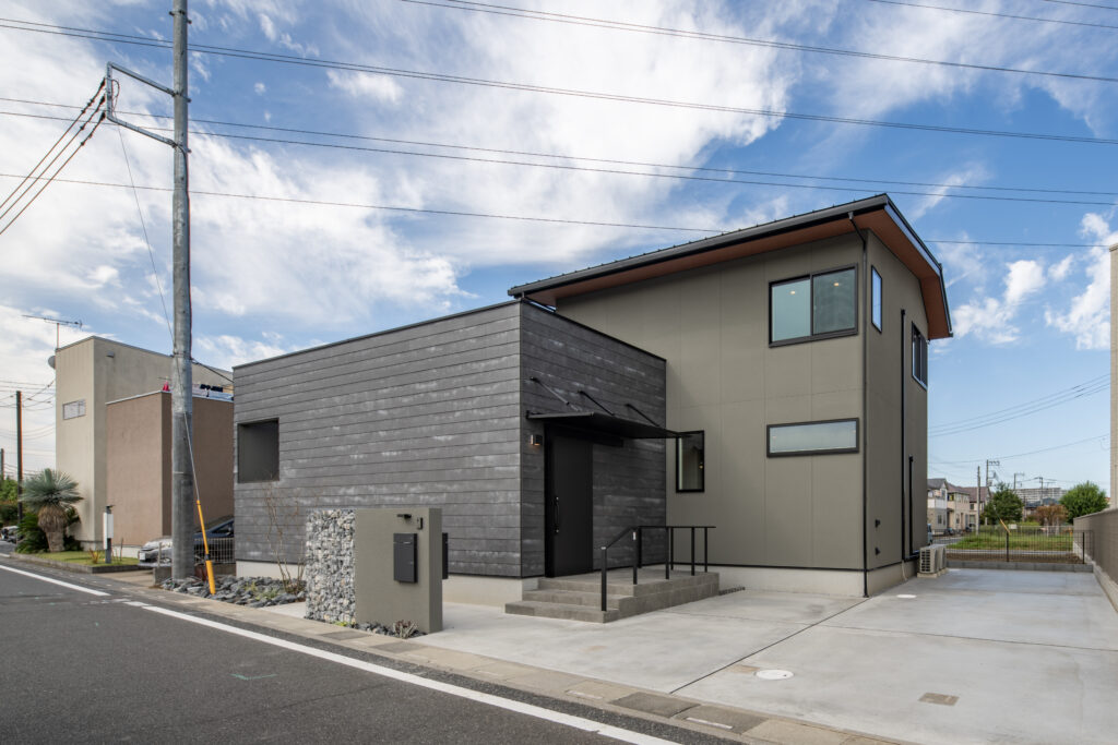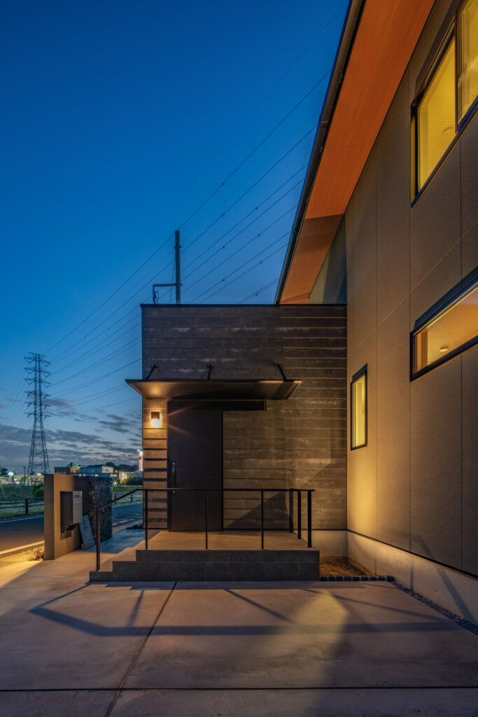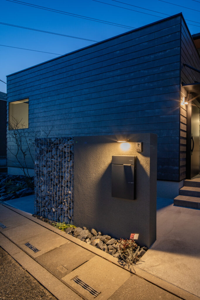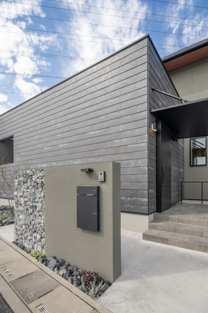 外観のデザインは正面の壁を高くデザインして風合いのあるセメント板を大胆に魅せ、2階建て部分のボリュームとの間に不思議な奥行きが感じられるようにしている。