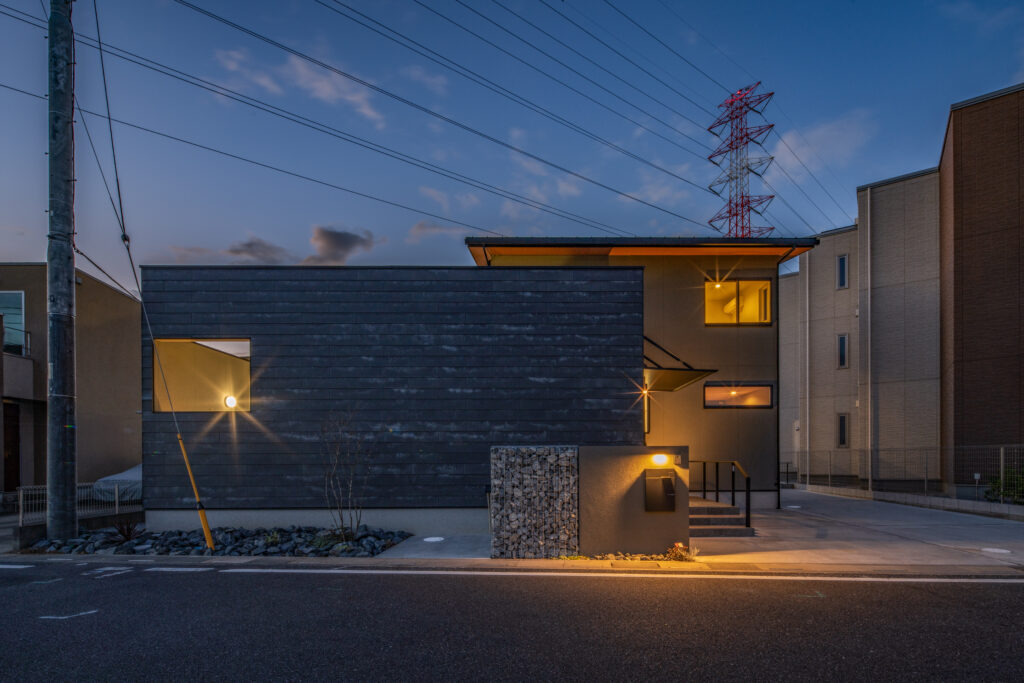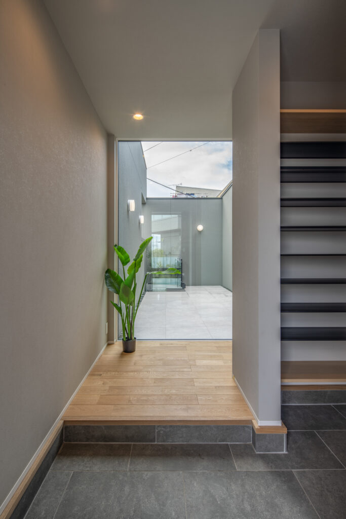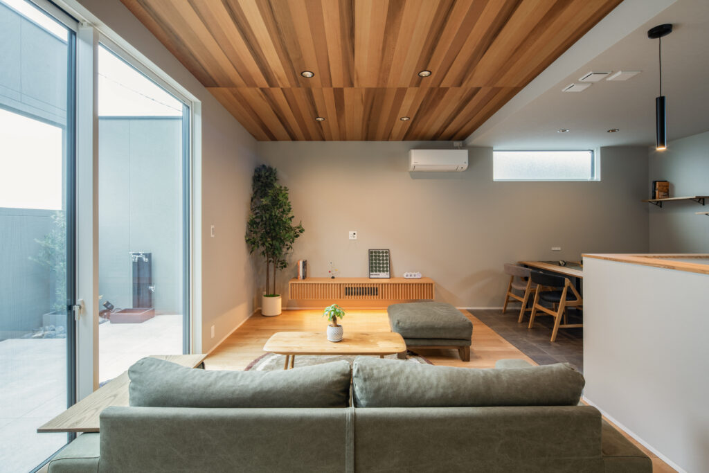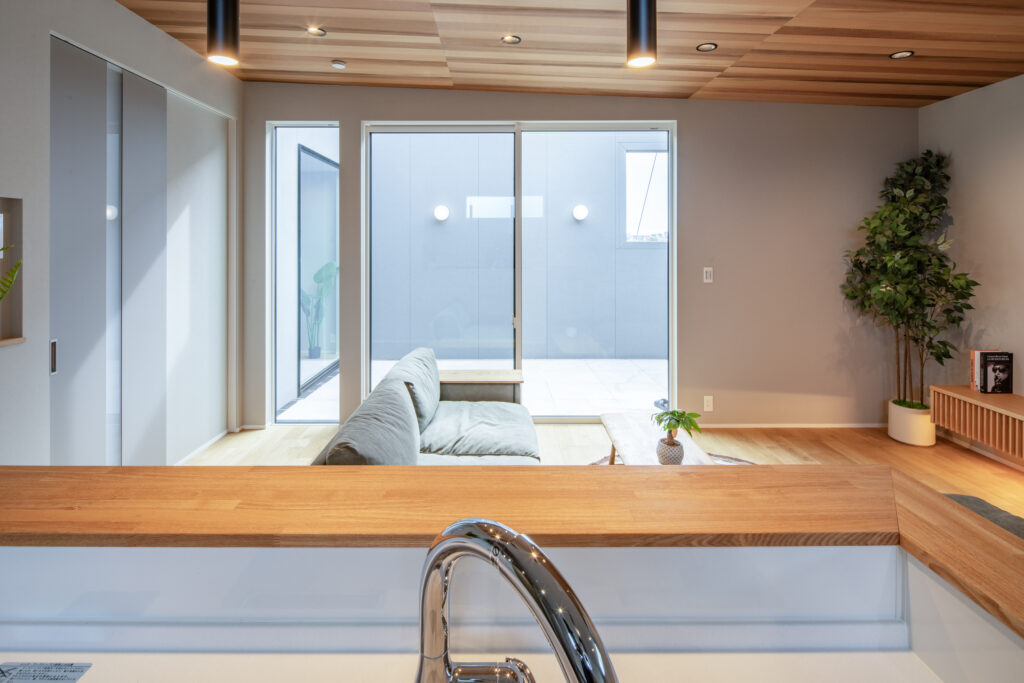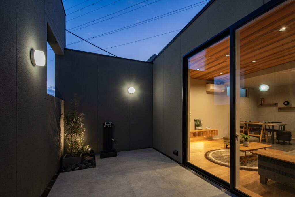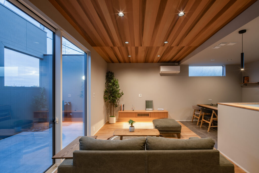 1階のLDKの南側には大きな開口部を設け十分な明るさを室内に取り込むようにしているが、道路際に高さのある外壁で庭を囲み内包することでプライバシーを確保し、外部空間をLDKの延長として楽しむことができるように配慮した設計とした。この様な目隠しの壁を作る際には、外構フェンスで計画をする場合もあるが、計画地域の法規制によりその様なフェンスを外構で作ることが出来ない事から、それに変わるものを建築と一体的に計画した事もポイントである。